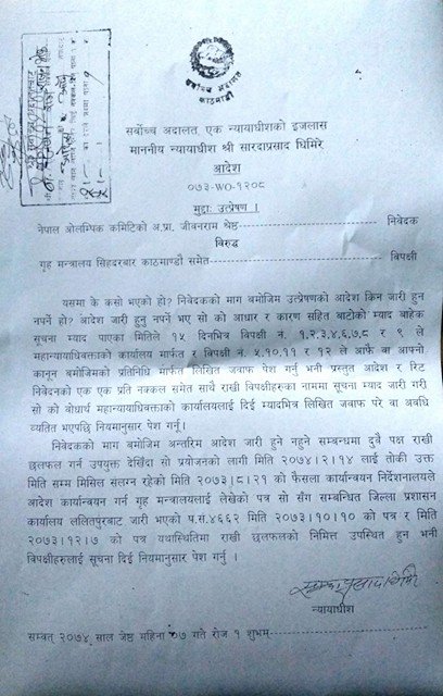 काठमाडौं (हाम्रो खेलकुद)– स्थानिय निर्वाचनका कारण केही मथ्थर देखिएको नेपाल ओलम्पिक कमिटी (एनओसी) को विवाद फेरी अदालतमा पुगेको छ । जीवन राम श्रेष्ठले नेतृत्व गरेको अन्तर्राष्ट्रिय ओलम्पिक कमिटी (एनओसी) को मान्यता प्राप्त एनओसीले अन्तरिम आदेशको माग गर्दै दायर गरेको मुद्दामा सर्वोच्च अदालतले यथास्थितीमा राखी विवादित दुवै पक्षलाई छलफलका लागि बोलाएको छ ।