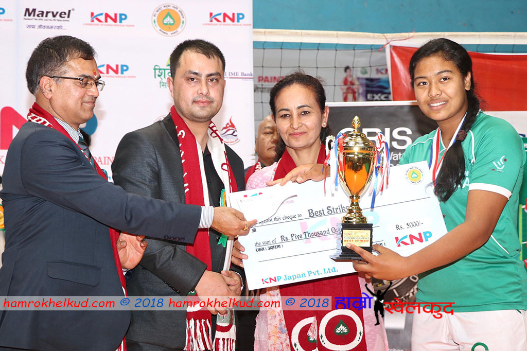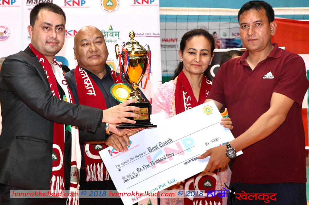 विजयी टिम तथा खेलाडीहरुलाई राखेपका सदस्यसचिव केशव कुमार विष्ट, नेपाल भलिबल संघका अध्यक्ष मनोरन्जन रमण शर्मा, महासचिव जितेन्द्र बहादुर चन्द, कन्सई नेरोलिक पेन्टस् (केएनपी) का प्रतिनिधि र शिवम् सिमेन्टका प्रतिनिधिहरु पुरस्कृत गरे । बैशाख २१ गतेबाट शुरु भएको प्रतियोगितामा विभिन्न ६ टोलीले लिग कम नकआउटको आधारमा प्रतिस्पर्धा गरेका थिए ।