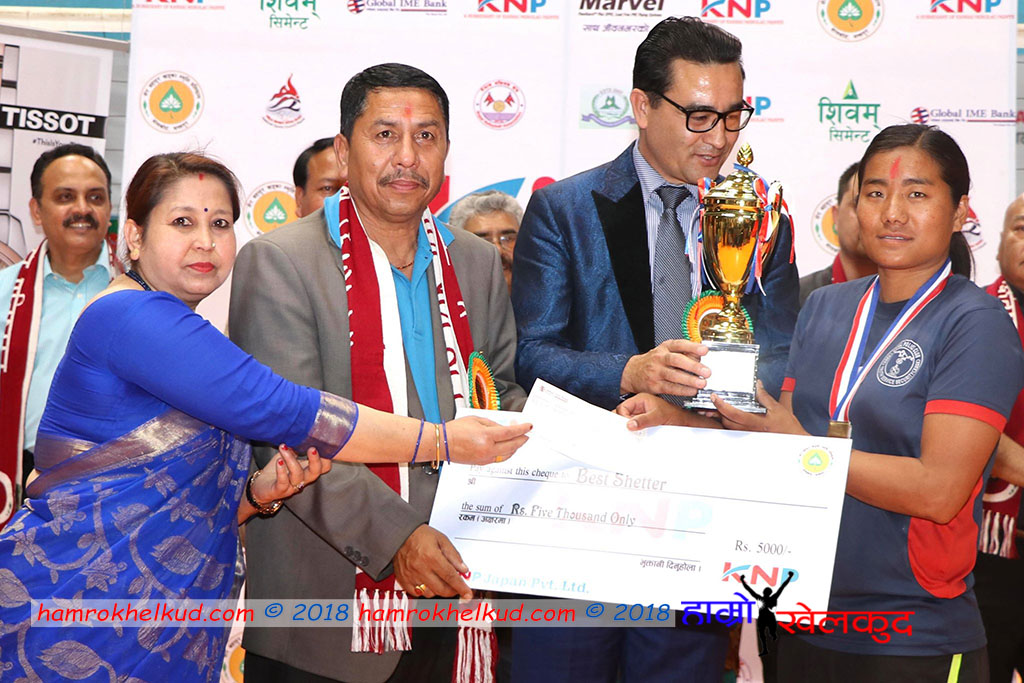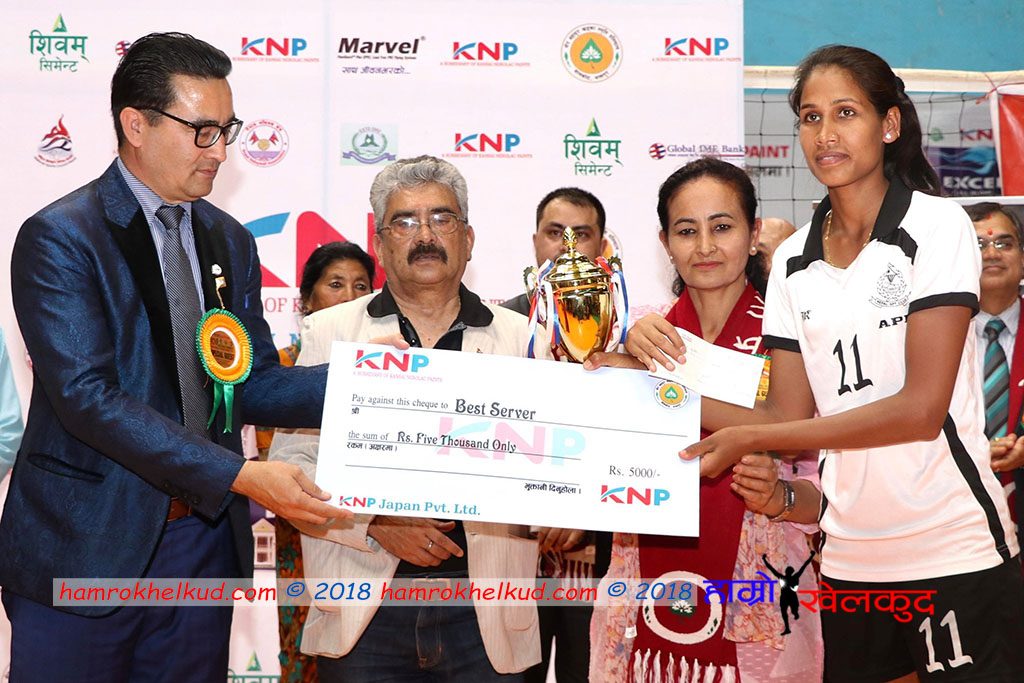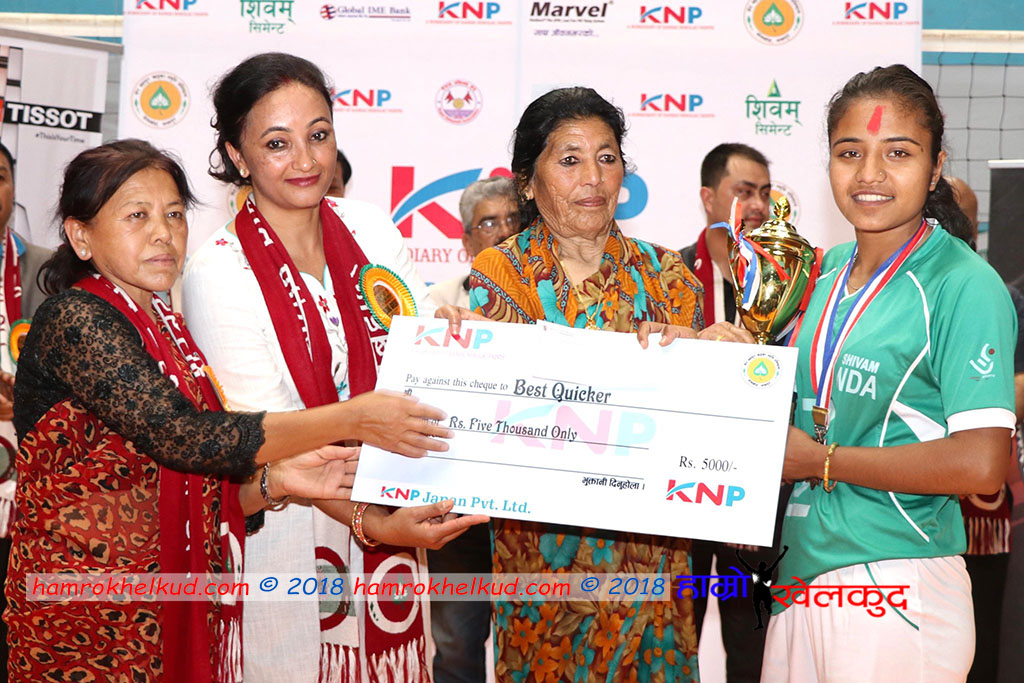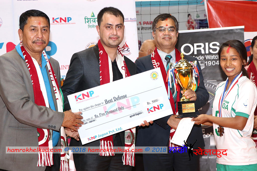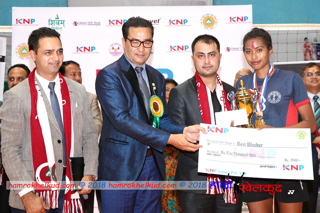 प्रतियोगिता व्यक्तिगत विधातर्फ शवम् न्यु डायमण्डकी प्रतिभा माली उत्कृष्ट स्पाइकर, सलिना श्रेष्ठ उत्कृष्ट डिफेन्स र कप्तान ललितानाथ उत्कृष्ट क्वीकर घोषित भए । पुलिसकी कमला पुन उत्कृष्ट सेटर र मनिषा चौधरी उत्कृष्ट ब्लकर घोषित हुदा एपिएफकी उषा विष्ट उत्कृष्ट सर्भर र ज्ञानेन्द्र विष्ट उत्कृष्ट प्रशिक्ष चुनिए । व्यक्तिगत विधातर्फको सबै विजेताले जनही ५ हजार रुपैया प्राप्त गरे ।