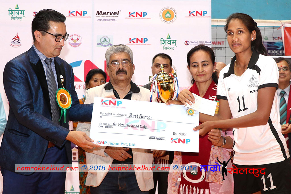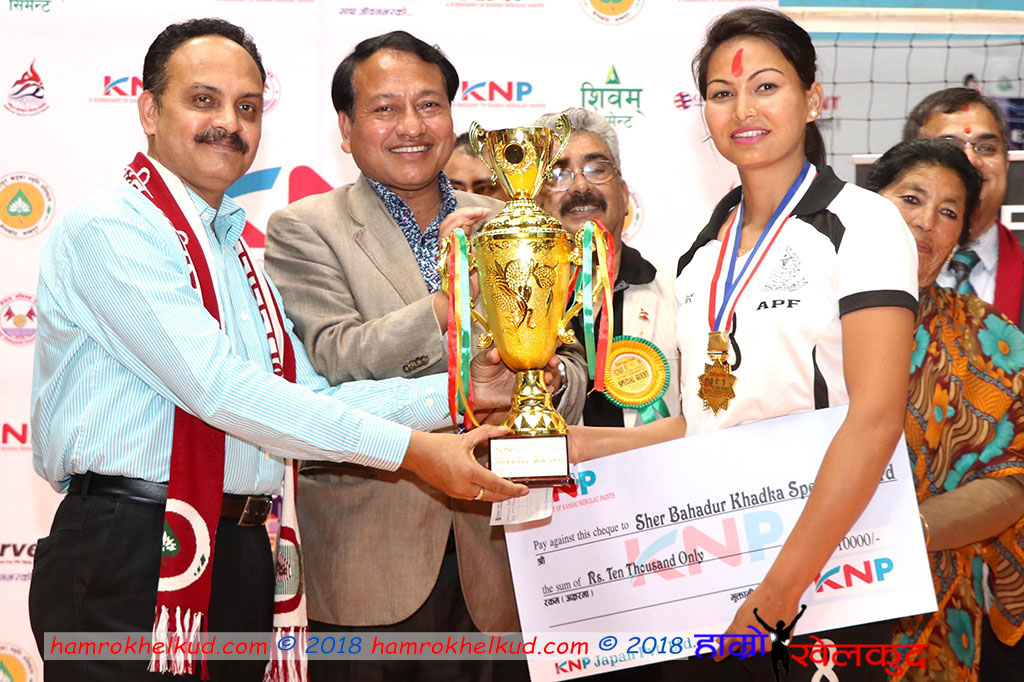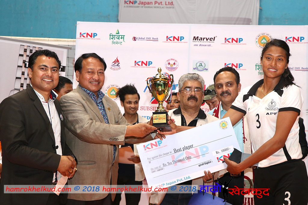 काठमाडौं (हाम्रो खेलकुद) – नेपाल एपिएफ क्लबले बर्षको पहिलो उपाधिका रुपमा शनिबार केएनपी राष्ट्रिय महिला भलिबल प्रतियोगिता जित्दा टोलीका महत्वपूर्ण खेलाडी सरस्वती चौधरी सर्वोत्कृष्ट खेलाडी घोषित भइन् भने रेश्मा भण्डारी शेरबहादुर खड्का स्पेशल अवार्डबाट सम्मानित भइन् । सरस्वती र रेश्मा दुवैले घडी र १० हजार रुपैयाँ प्राप्त गरे ।