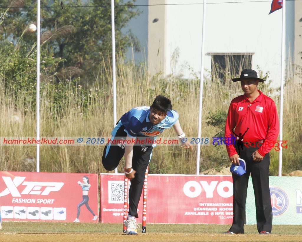 विराटनगरका जितेन्द्र मुखियाले ४ विकेट लिए । किशोर महतो, सुनिल धमला, सन्दीप लामिछाने र मोहम्मद जायद आलमले समान १ विकेट लिए । विराटनगरले केहीबेरमा जवाफी ब्याटिङ थाल्नेछ । दुवै टोली पहिलो जितको खोजीमा छ । विराटनगर पहिले खेलमा पोखरा पल्टनसँग ५८ रनले पराजित भएको थियो । धनगढी ब्लुज हुलास काठमाडौं रोयल्ससँग १७ रनले पराजित भएको थियो ।