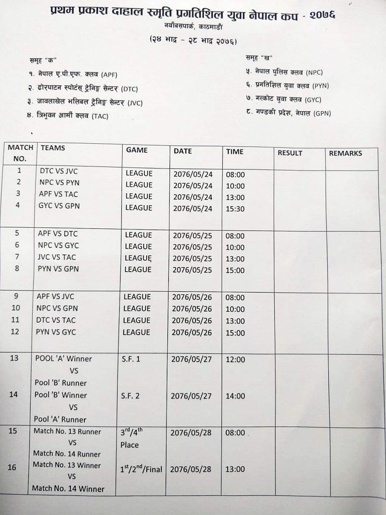 दुवै समूहका शीर्ष २ टोली अन्तिम चारमा प्रवेश गर्नेछन् । मंगलबार पहिलो खेलमा ढोरपाटन र जावलाखेल खेल्नेछन् । दोस्रो खेलमा पुलिस र प्रगतिशीलले प्रतिस्पर्धा गर्नेछन् । उद्घाटन समारोहलगत्तै हुने खेलमा एपीएफ र आर्मीले प्रतिस्पर्धा गर्नेछन् । अन्तिम खेल गल्कोट र गण्डकीबीच हुनेछ ।