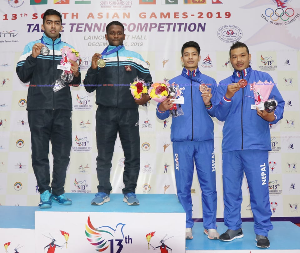 काठमाडाैं (हाम्राे खेलकुद) – १३ औं साग अन्तरगतकाे टेबल टेनिसका नेपाल च्याम्पियन स्यान्टु श्रेष्ठ र पुरुषाेत्तम बज्राचार्य पुरुष एकलमा कास्यपदक जितेका छन् ।