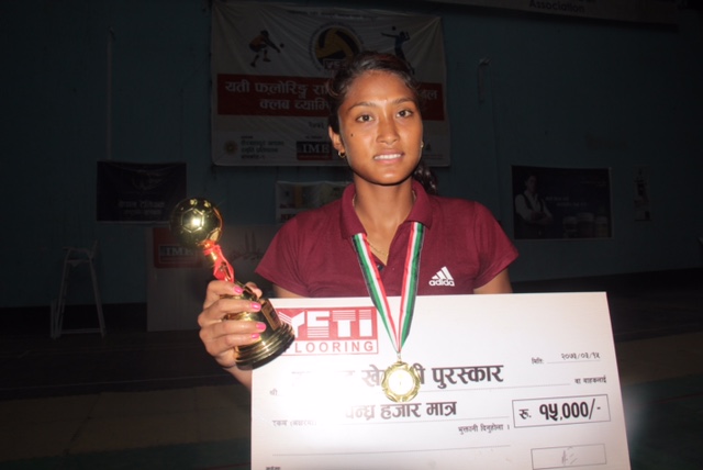 एपिएफकी सरस्वती चौधरी सर्वोत्कष्ट खेलाडीबाट पुरस्कृत भइन् । सरस्वतीले १५ हजार र बुद्ध एयरको माउन्टेन फलाइट टिकट प्राप्त गरिन । उत्कृष्ट खेलाडिको नगद सौजन्य अम्बिका शर्माले गरेकी थिईन् । यसैगरी प्रतियोगितामा न्यु डायमन्ड एकेडेमीकी प्रतिभा माली उत्कृष्ट स्पाइक, एपिएफकी नेविका चौधरी उत्कृष्ट सर्भर, उषा विष्ट उत्कृष्ट ब्लकर, बिनिता बुढाथोकी उत्कृष्ट सेटर, नेपाल पुलिस क्लबकी कमला पुन उत्कृष्ट डिफेन्स भइन् । एपिएफलका सुदेशकुमार रिमाल उत्कृष्ट प्रशिक्षक चुनिए ।