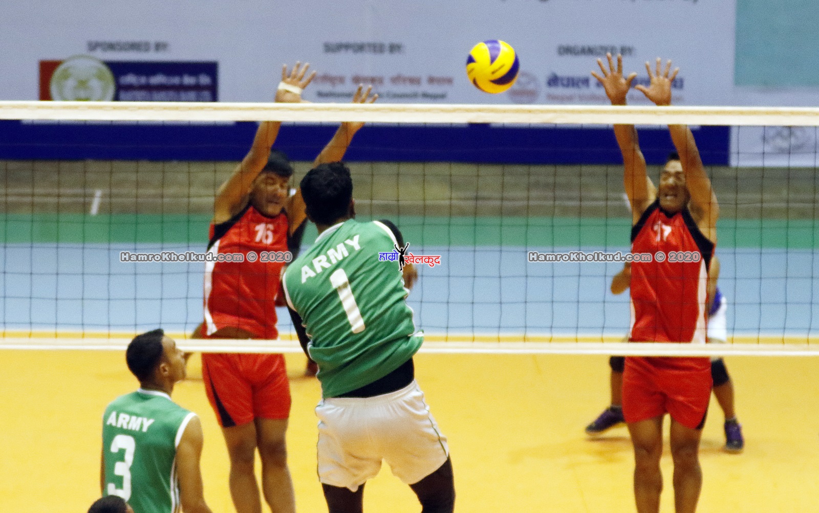 आर्मीले समूह ए को पहिलो खेलमा आरजी भलिबल ग्रुपलाई ३-० को सेटमा पराजित गर्यो । पहिलो सेट २५-९ को फराकिलो अन्तरले जितेको आर्मीले दोस्रो सेट २५-१६ ले आफ्नो पक्षमा पार्यो । तेस्रो सेट पनि २५-९ कै स्कोरमा हासिल गर्दै आर्मीले महत्त्वपूर्ण तीन अंक हासिल गरेको छ ।
