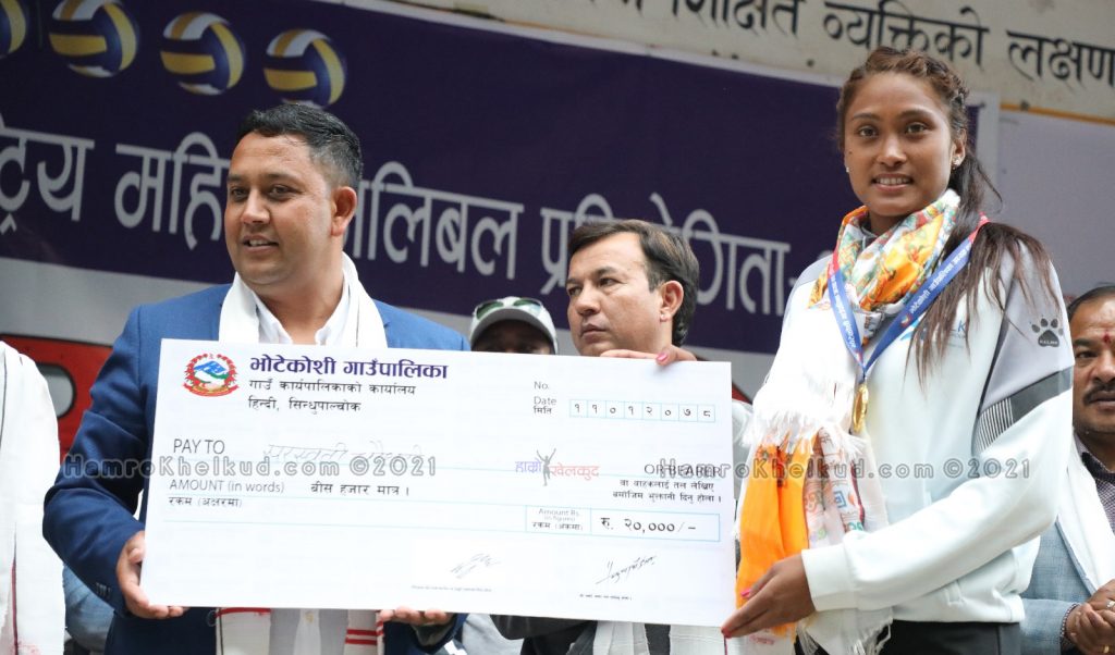 एपिएफकी विनिता बुढाथोकी उत्कृष्ट सेटर चुनिदा एपिएफका महेश चौधरी उत्कृष्ट प्रशिक्षक चुनिए । व्यक्तिगत विधाका सबै उत्कृष्टले समान ७–७ हजार रुपैया हात पारे ।