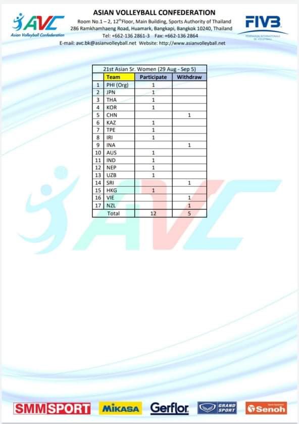 फिलिपिन्समा भदौ १३ गते देखि २० गते सम्म आयोजना हुने च्याम्पिनसिपबाट चीन, इन्डोनेसिया, श्रीलंका, भियतनाम र न्यूजिल्यान्डले नाम फिर्ता लिएको नेपाल भलिबल संघका महासचिव जितेन्द्र चन्दले जानकारी दिए । एक साता चल्ने च्याम्पियनसिपमा अब नेपालसहित अब १२ राष्ट्रले भाग लिनेछन् । जसमा आयोजक फिलिपिन्ससहित जापान, थाइल्यान्ड, दक्षिण कोरिया, काजकिस्तान, ताइपे, इरान, अष्ट्रेलिया, भारत, नेपाल र उज्वेकिस्तान, हङकङ छन् ।