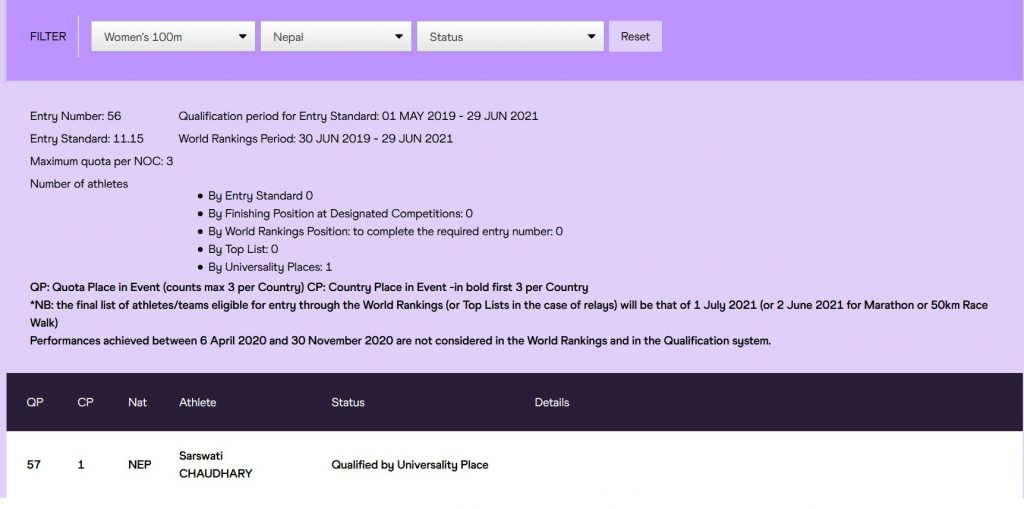 शुक्रबार एनओसीले ओलम्पिक सहभागिताका लागि स्प्रिन्टरको नाम मागेपछि नेपाल एथलेटिक्स संघले सरस्वती चौधरीको नाम पठाएको थियो । संघका अध्यक्ष राजीवविक्रम शाहले भने, ‘एनओसीले स्प्रिन्टरको नाम मागेपछि हामीले अहिले हामीसँग भएको उत्कृष्ट मध्ये र विश्व च्याम्पियनसिप पनि खेलेकोले सरस्वतीको नाम पठाएका छौं ।’