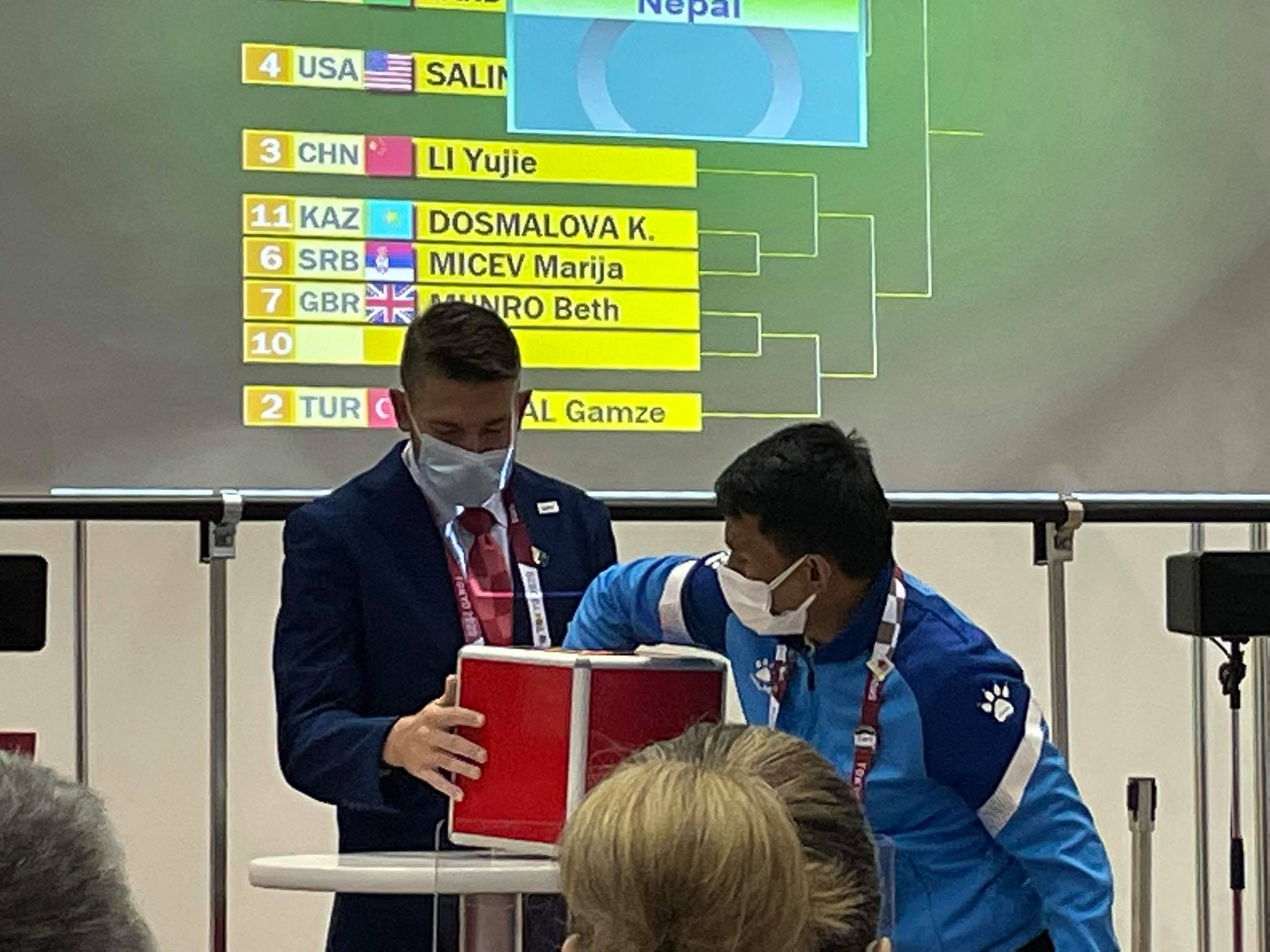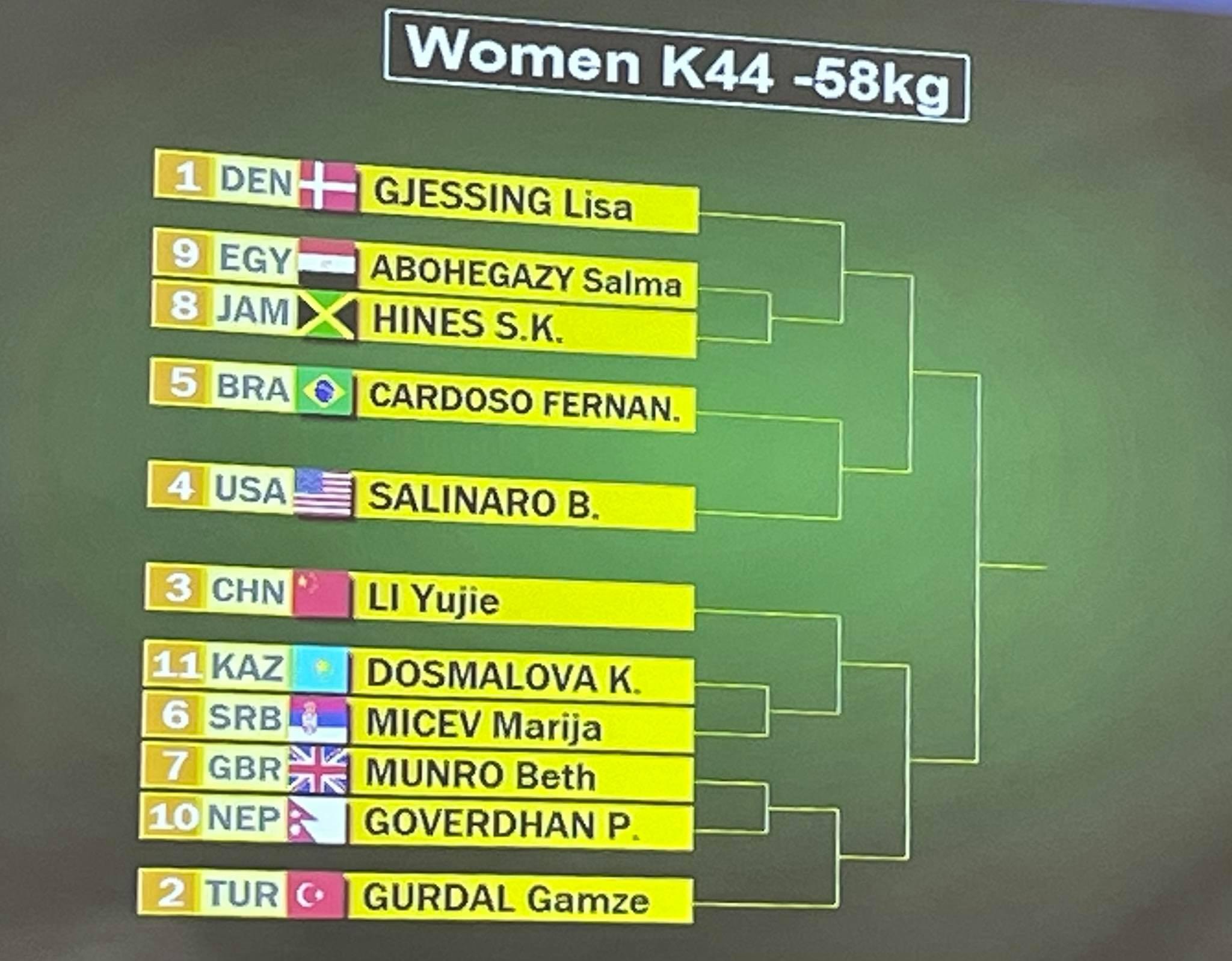 महिला के४४ विधाको ५८ केजी तौल समूहमा उनले प्रि-क्वाटरफाइनलमा खेल सुरु गर्दैछिन् । कुल ११ खेलाडीले प्रतिस्पर्धा गर्ने यस तौल समूहमा ५ खेलाडीले भने सिधै क्वाटरफाइनलमा स्थान बनाएका छन् ।