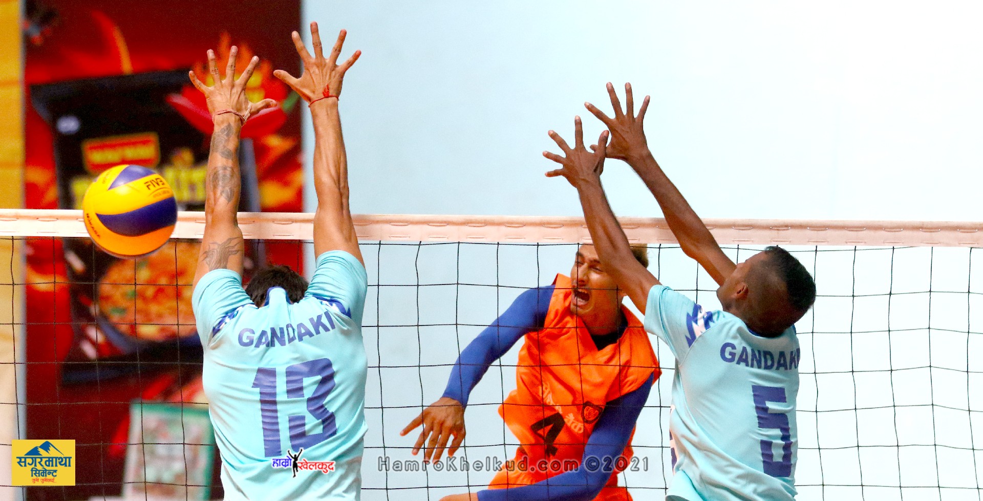 समूह ‘बी’ को खेलमा गण्डकी प्रदेशले दावाली मिलन क्लबलाई ३–१ को सेटमा पराजित गर्दै विजयी सुरुवात गरेको छ । पहिलो सेटमा २५–१२ को सहज जित निकालेको गण्डकीले त्यसपछिको सेटमा संघर्ष गर्नुपर्दा दोस्रो सेटमा २५–२२ को जित निकाल्दा तेस्रो सेट २०–२५ ले गुमाउन पुगेको थियो । चौथो सेटमा पछि परेको अवस्था उल्ट्याउँदै गण्डकीले २७–२५ को जित निकाल्न सफल भयो ।