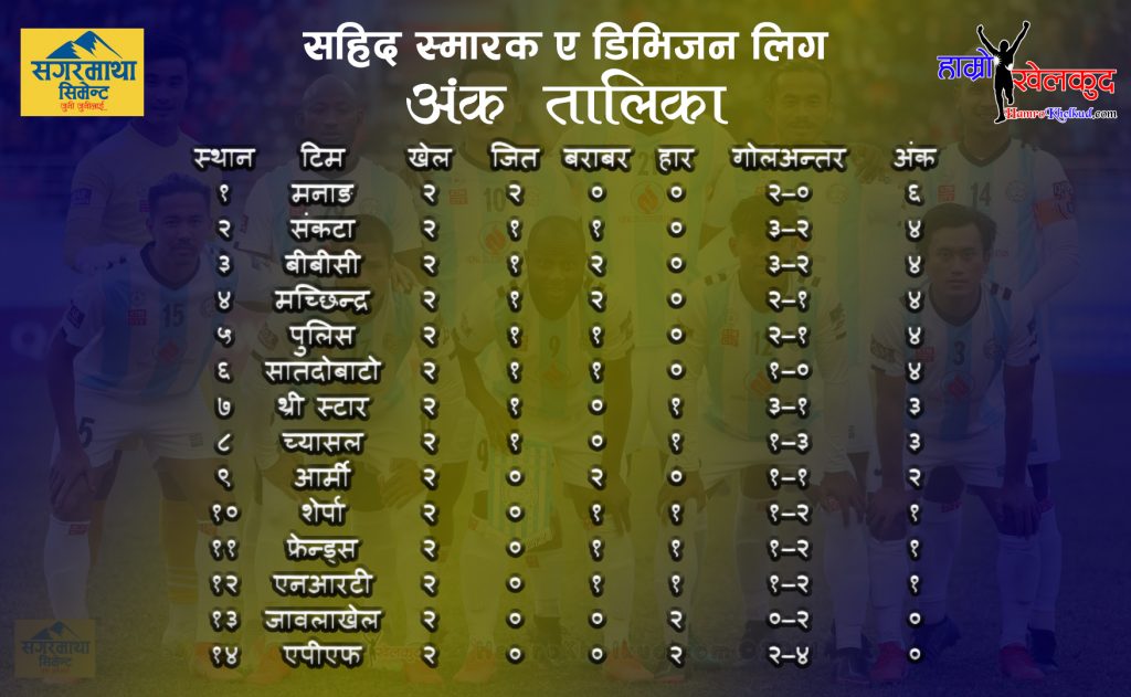 सहिद स्मारक ए डिभिजन लिगको अंक तालिका