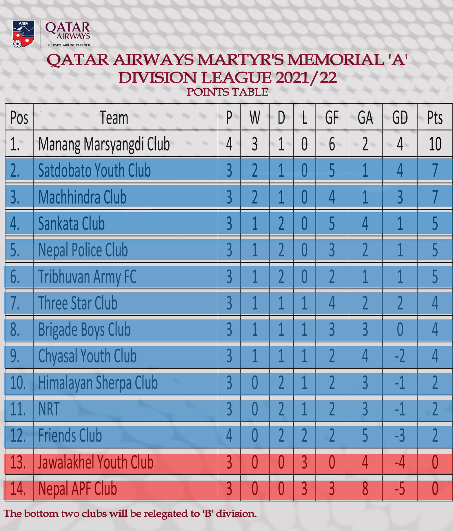 काठमाडौं (हाम्रो खेलकुद)– सातदोबाटो युथ क्लब र मच्छिन्द्र फुटबल क्लबले कतार एअरवेज सहिद स्मारक ए डिभिजन लिगमा शनिबार अलग अलग खेलमा प्रतिस्पर्धा गर्दैछन् । शीर्षस्थानको प्रतिस्पर्धामा रहेका सातदोबाटो र मच्छिन्द्र दुवैको समान ७ अंक छ । शुक्रबार आ आफ्नो खेल जित्दै मनाङ मस्र्याङ्दी क्लब शीर्ष र त्रिभुवन आर्मी फुटबल क्लब दोस्रो स्थानमा उक्लेका छन् ।