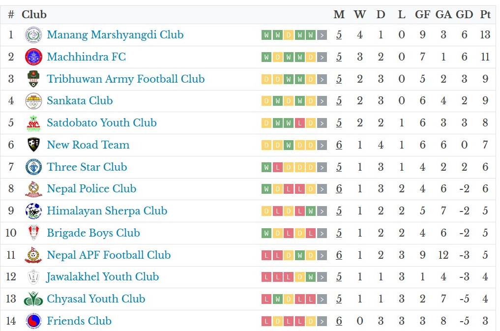 पाँचौं चरणमा दुवै टोलीले ३–० को हार बेहोरेका थिए । दशरथ रंगशालामा एपिएफले फ्रेन्ड्सलाई र पोखरामा मनाङ मस्र्याङ्दी क्लबले पुलिसलाई समान ३–१ ले हराएका थिए । अंक तालिकाको पुछारमा रहेको फ्रेन्ड्सको यो तेस्रो बराबरी हो । अन्य तीन खेलमा भने फ्रेन्ड्स पराजित भएको थियो । टोली अहिले पनि अंक तालिकाको पुछारमा यथावत रहेको छ ।