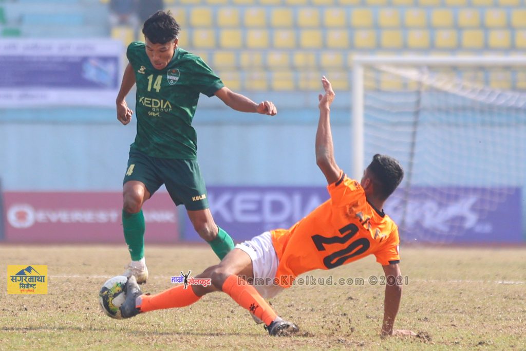 ३८औं मिनेटमा आशिष लामाको वान भर्सेस वानको प्रहार गोलरक्षक विकेशलाई लाग्दै पोस्टतर्फ अघि बढ्दा युद्ध शाहीले बचाए । ५८औं मिनेटमा नविन लामाको प्रहारलाई गोलरक्षक विकेशले पञ्च गर्दै बचाए । ६३औं मिनेटमा जर्ज प्रिन्स कार्कीले गोल गर्दै आर्मीलाई १–० को अग्रता दिलाए । दिनेश हेन्जनको पासमा जर्ज प्रिन्सले ५ डिफेन्डरबीचबाट गरेको प्रहार डिफेन्डर राजन गुरुङलाई लाग्दै गोलमा परिणत हुँदा गोलरक्षक युयाले बचाउन सकेनन् ।