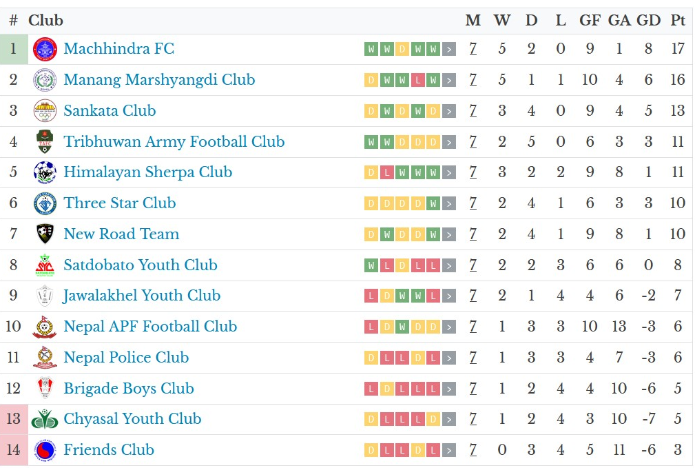 अंक तालिकाको पुछारमा रहेको फ्रेन्ड्समाथि भने रेलिगेसनको दबाब झन् बढेको छ । थ्री स्टारले लिगमा दोस्रो जित निकाल्ने क्रममा जावलाखेल युथ क्लबमाथि २–१ को जित निकाल्यो । रेलिगेसन दबाबमा रहेको अर्को टोली च्यासल युथ क्लबले लिगमा सफल नतिजा निकालिरहेको संकटा क्लबलाई गोलरहित बराबरीमा रोक्यो । हिमालयन शेर्पा क्लबले लिगमा निरन्तरत तेस्रो जित निकाल्ने क्रममा सातदोबाटो युथ क्लबलाई १–० ले पराजित गर्यो । सातौं चरणका ७ खेलमा जम्मा १३ गोल सम्भव भएको थियो ।
