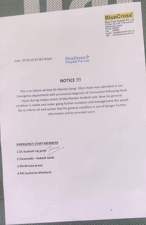 ब्लु क्रसले शनिबार दिउँसो ३ः४५ विज्ञप्ती जारी गर्दै मनिषको आकष्मिक कक्षमा उपचार भइरहेको जनाएको छ । ‘च्यासलविरुद्धको खेलमा मनिषको टाउकोमा चोट लागेको थियो । अहिले उनको अवस्था सामान्य र स्थिर रहेको छ । थप जानकारी पछि दिइने छ । उनी खतरा मुक्त रहेका छन्,’ विज्ञप्तीमा भनिएको छ ।