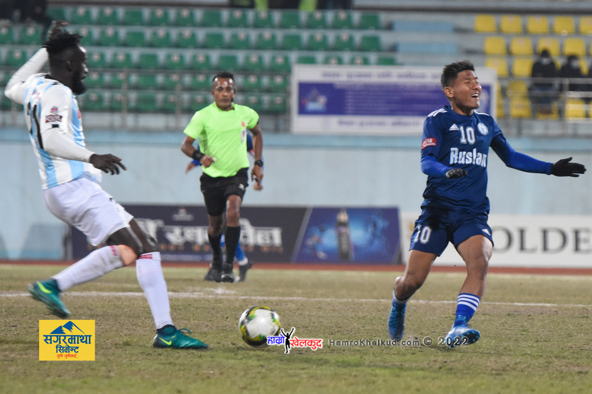 ७१औं मिनेटमा ऋतिक कुमार खड्काले गोल गर्दै खेललाई १–१ गोलको बराबरीमा ल्याए । सन्जोक राई, ऋतिक र अन्सुमाना क्रोमाहको समन्वयमा बनेको मुभमा ऋतिको पेनाल्टी बक्सबाहिरको प्रहार पोलमा लाग्दै गोलमा परिणत भएको थियो । त्यसपछि थप गोल निस्कन नसक्दा खेल बराबरीमा टुंगियो ।