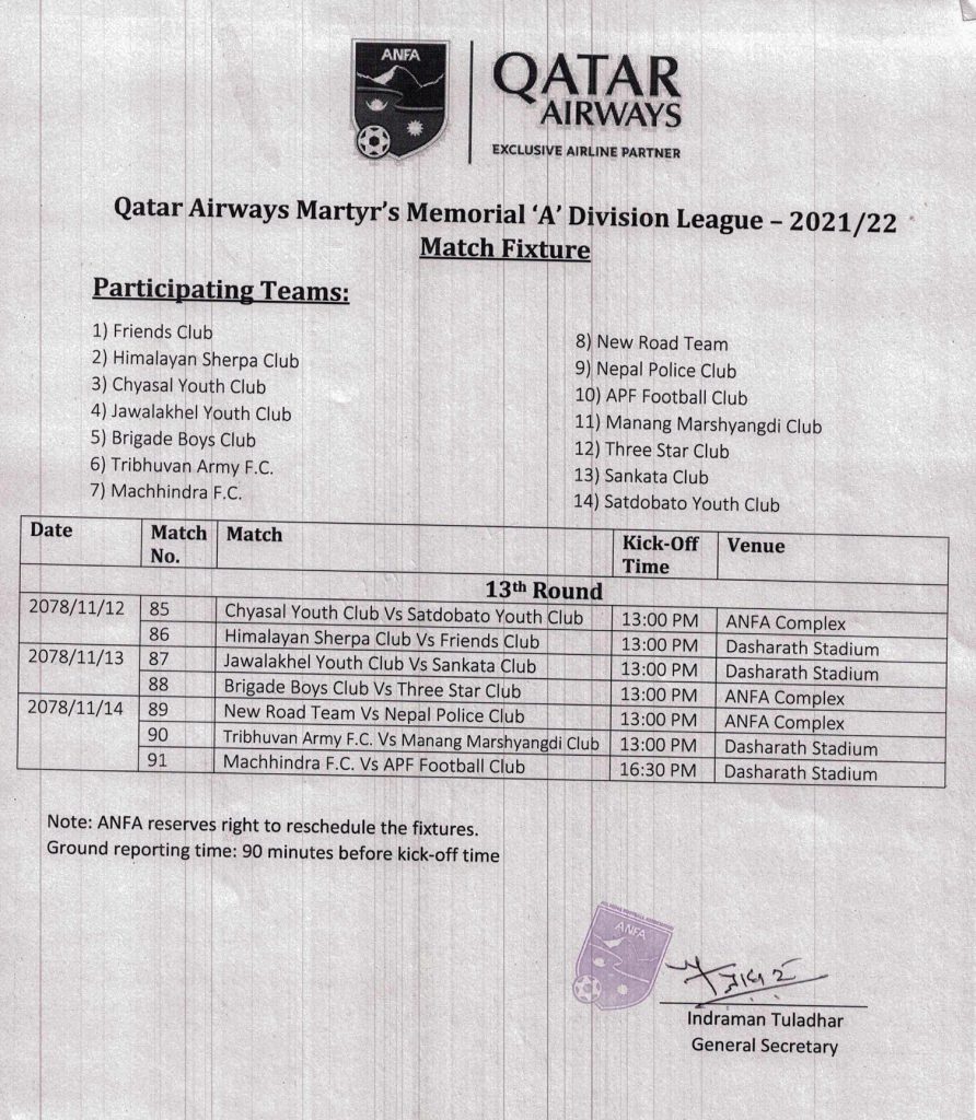 फागुन १३ गते जावलाखेल युथ क्लब र संकटा क्लबबीच दशरथ रंगशाला र सोही दिन एन्फामा ए डिभिजनबाट घटुवा भइसकेको ब्रिगेड ब्वाइज क्लबले थ्री स्टार क्लबको सामना गर्नेछ । लिगको अन्तिम दिन फागुन १४ गते शनिबार ३ खेल हुनेछन् । एन्फा मैदानमा न्युरोड टिम एनआरटीले नेपाल पुलिस क्लबबीच प्रतिस्पर्धा हुनेछ ।