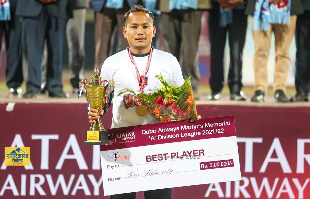 काठमाडौं (हाम्रो खेलकुद) – लिग च्याम्पियन मछिन्द्र फुटबल क्लबका मिडफिल्डर सुनिल बल यसवर्षको कतार एअरवेज सहिद स्मारक ‘ए’ डिभिजन लिगको सर्वाेत्कृष्ट खेलाडी बनेका छन् ।