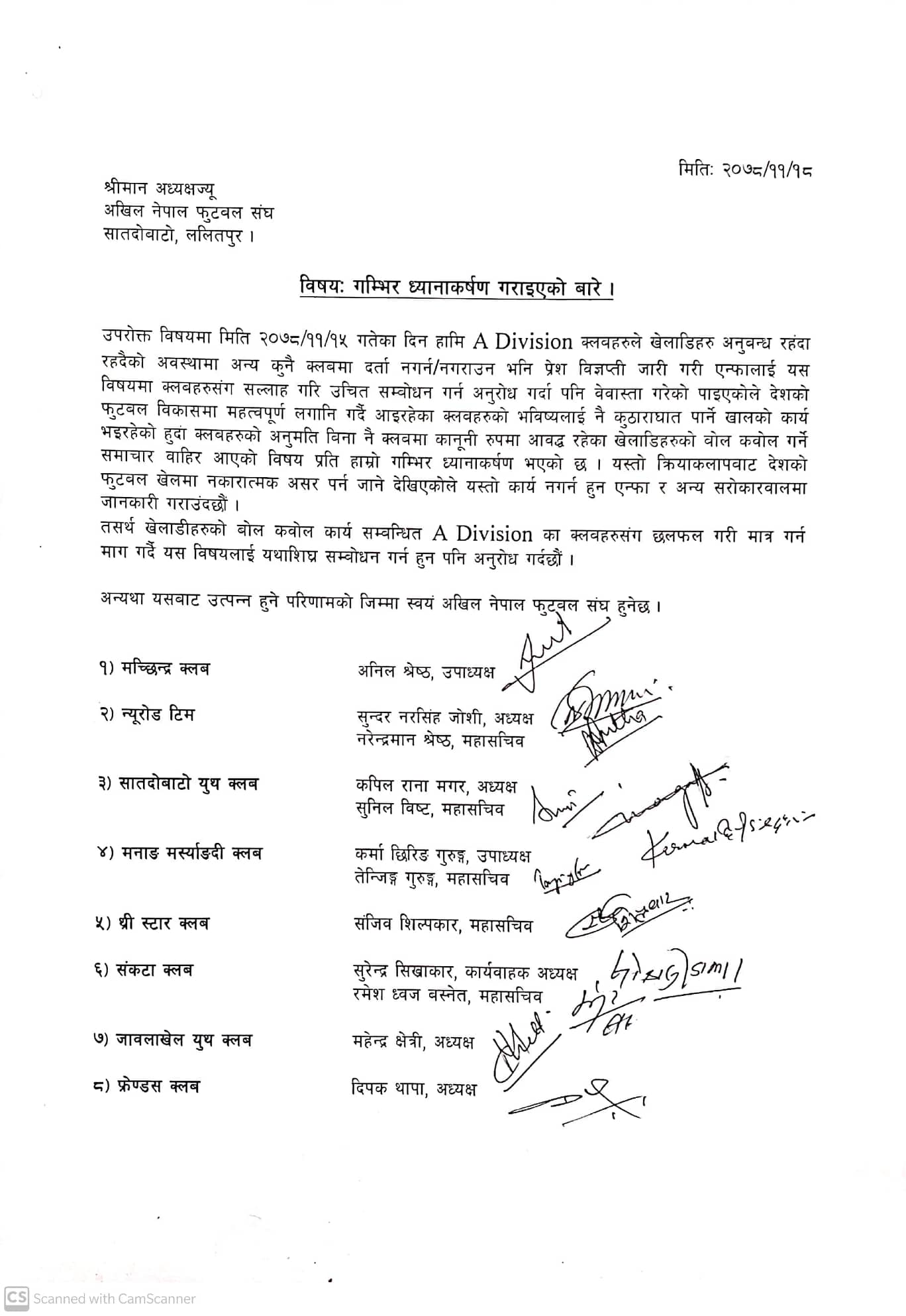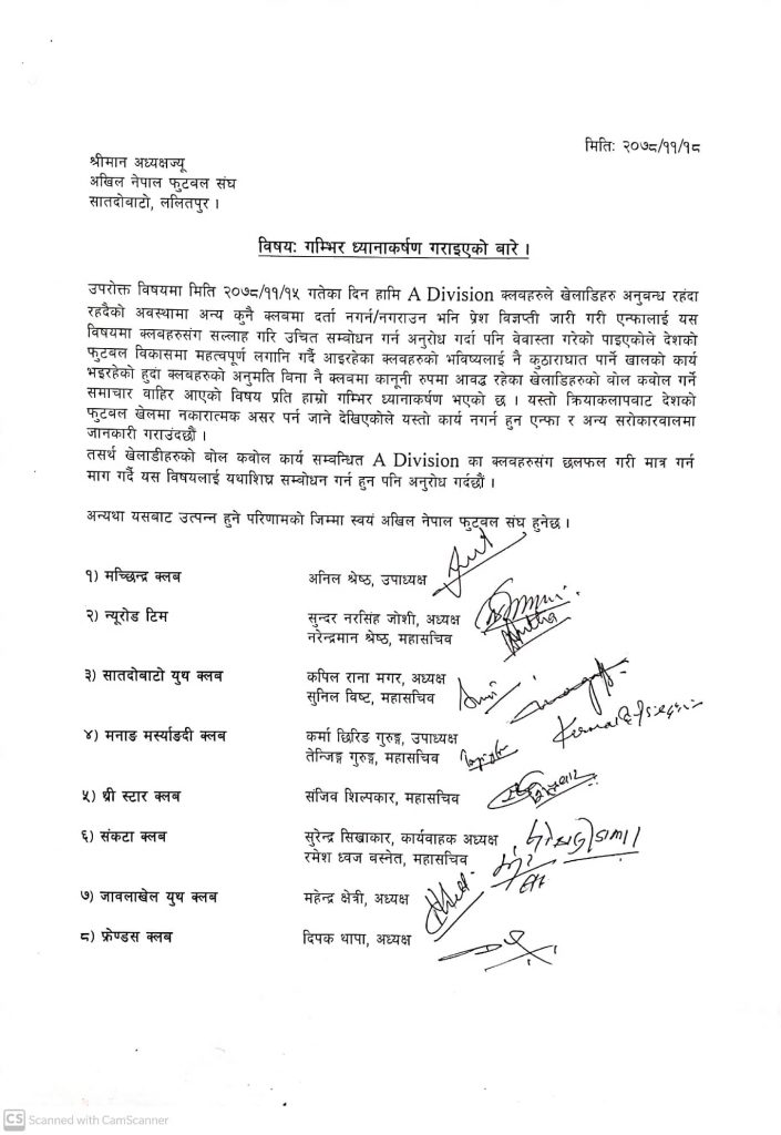 ए डिभिजनका ८ क्लबले पत्रमा भनेका छन्, ‘फुटबल विकासमा महत्वपूर्ण लगानी गर्दै आइरहेका क्लबहरुको भविष्यलाई कुठाराघात पार्ने खालको कार्य भइरहेको हुँदा क्लबहरुको अनुमति विना नै क्लबमा कानुनी रुपमा आबद्ध रहेका खेलाडीहरुको बोल कबोल गर्ने समाचार बाहिर आएको विषय प्रति गम्भिर ध्यानाकर्षण भएको छ ।’