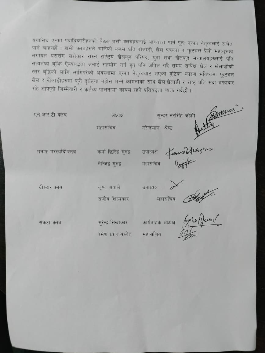४ क्लबको संयुक्त विज्ञप्तीमा भनिएको छ, ‘क्लबहरुको लगानीमा फुटबल एकेडेमीमा सहभागी देशभरका विभिन्न उमर समूहका खेलाडीहरु र आधिकारिक ए डिभिजन क्लबलगायत बी र सी डियिजभनका क्लबहरु र जिल्ला फुटबल संघहरुको भविष्य पनि समाप्त हुन सक्ने आशंका रहेकोले यथाशीघ्र एन्फा पदाधिकारीहरुको बैठक बसी क्लबहरुलाई आवश्त पार्न पुनः एन्फा नेतृत्वलाई सचेत गराउन चाहन्छौं ।’