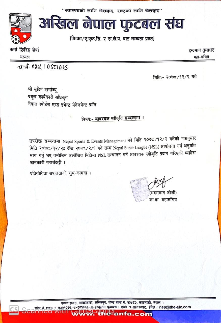 एनएसएलको दोस्रो संस्करण चैत २५ देखि जेठ १ गते सम्म आयोजना गर्न अनुमति माग बमोजिम सोहि दिनमा सञ्चालन गर्न स्वीकृति दिएको एन्फाले पत्रमा लेखेको छ । एनएसएलका कारण उत्पन्न विवाद समाधानका लागि एन्फाले अध्यक्ष कर्मा छिरिङ शेर्पाको संयोजकत्वमा ७ सदस्यीय कार्यदल गठन गरेको थियो । एनएसएलका कारण फुटबलमा अन्यौलता बढेको भन्दै विरोधमा रहेका ए डिभिजनका ४ क्लबका प्रतिनिधि र एनएसएल आयोजकसँग बुधबार कार्यदलले अलग अलग छलफल गरेको थियो ।