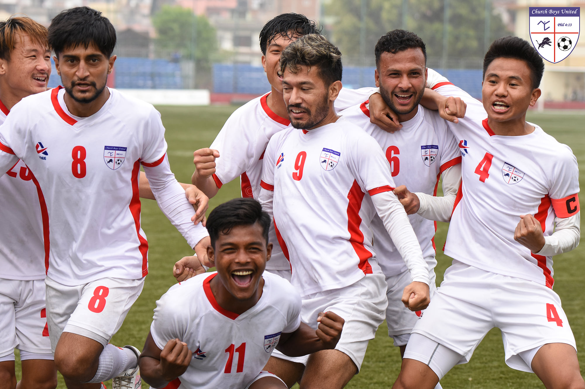 सातदोबाटोस्थित एन्फा कम्प्लेक्सको खेल मैदानमा बुधबार भएको खेलमा चर्च ब्वाइजको जितमा कुवेर न्यौपाने र आशिष चापागाईले गोल गरे । दुवै गोल दोस्रो हाफमा भएको थियो । प्रतिस्पर्धात्मक खेलको ५२औं मिनेटमा कुवेर न्यौपानेको गोलबाट चर्च ब्वाइजले सुरुवाती अग्रता बनाएको थियो । ७५औं मिनेटमा आशिष चापागाईले गोल गर्दै चर्च ब्वाइजको जित पक्का गरे ।