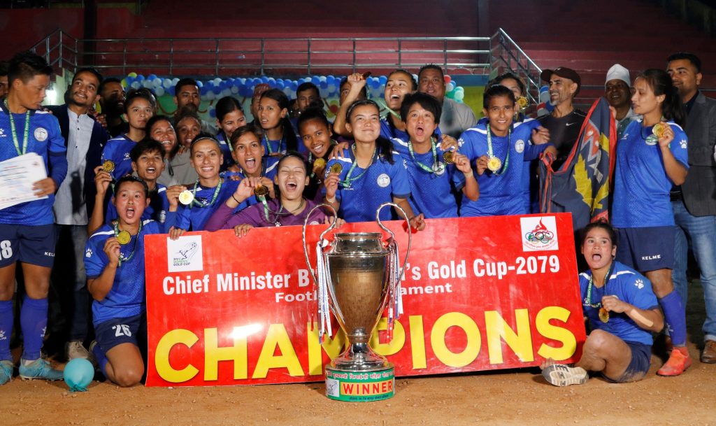 धनगढी (हाम्रो खेलकुद)– नेपाल पुलिस क्लबले प्रथम मुख्यमन्त्री विवाइसी महिला गोल्ड कप फुटबल प्रतियोगिताको उपाधि जितेको छ । धनगढी रंगशालामा शनिबार साँझ भएको फाइनलमा अर्को विभागिय टोली एपिएफ क्लबलाई १–० ले हराउँदै उपाधि जितेको हो ।