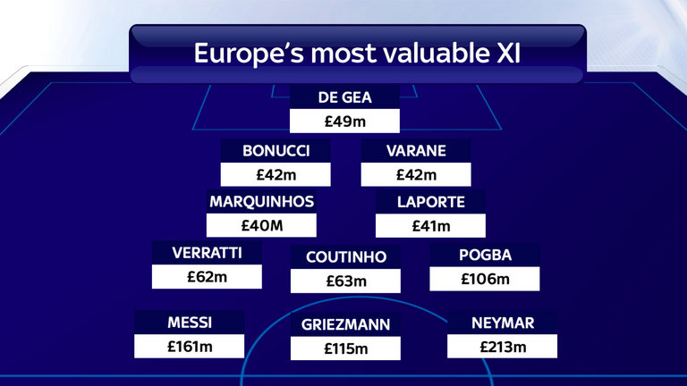 त्यस्तै सेन्टर मिड्फिल्डमा म्यान्चेस्टर युनाइटेडका १०६ मिलियन पाउन्डका पोग्बा र पि एस जि का ६५ मिलियनका भेराटिले स्थान पाएका छन ।