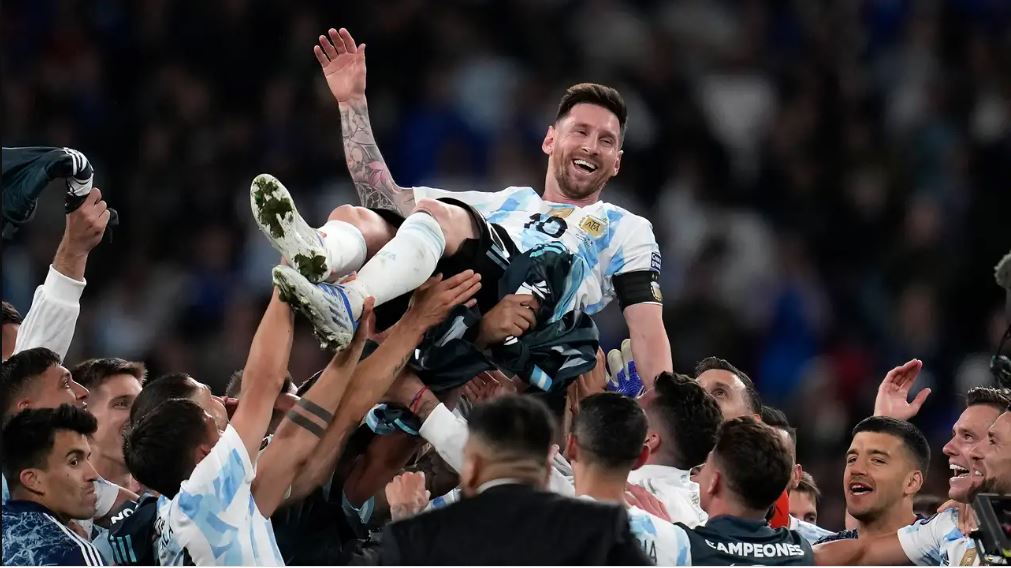 इंग्ल्याण्डको वेम्बलीमा बुधबार राति अन्तरमहादेशीय च्याम्पियनबीचको प्रतिस्पर्धा फाइललिसिमामा मेस्सी प्रेरित अर्जेन्टिनाले इटालीलाई ३–० ले पराजित गर्दै उपाधि जितेपछि उनका सहयात्रीले सुपरस्टार मेस्सीलाई हावामा उठाएर उत्सव मनाए ।