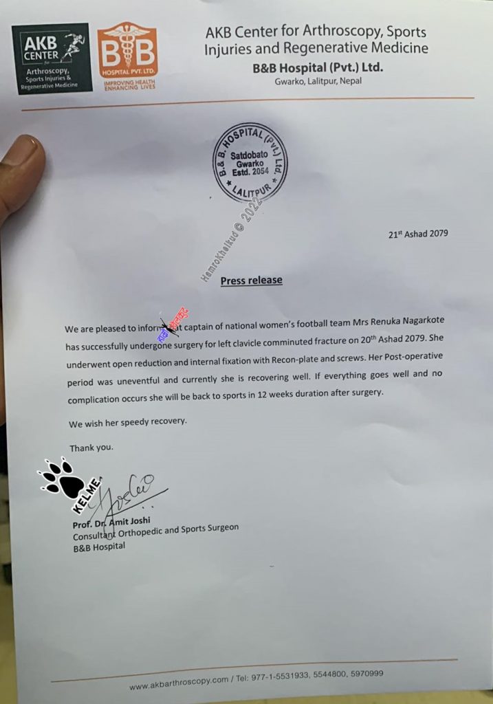 शल्यक्रिया सफल भएको र कुनै समस्या नआएमा रेनुकालाई मैदान फर्कन करिव ३ महिना लाग्ने अस्पतालले जनाएको छ ।