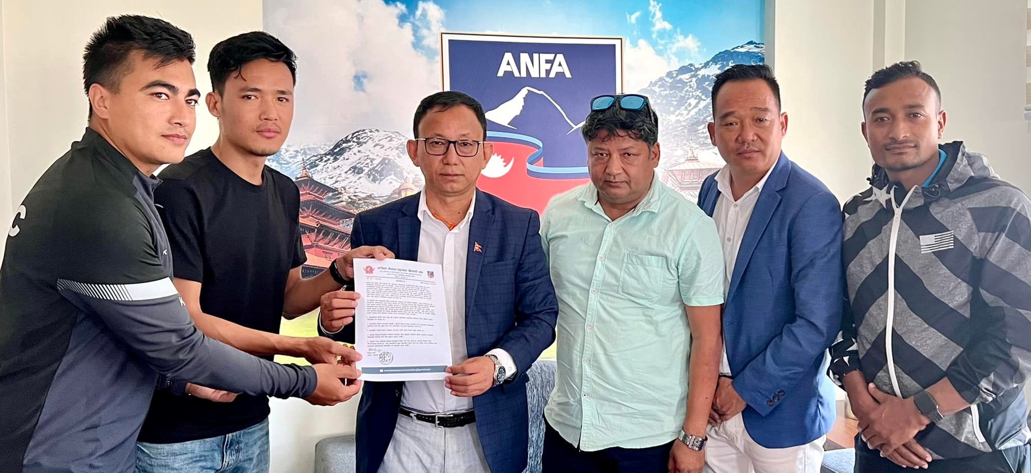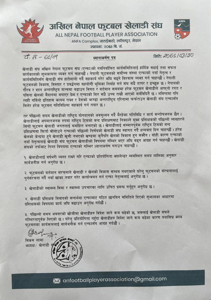 काठमाडौं (हाम्रो खेलकुद)– अखिल नेपाल फुटबल संघ (एन्फा) अन्तर्गतको फुटबल खेलाडी संघले ५ बुँदासहित ध्यानाकर्षण गराएको छ । खेलाडी संघका अध्यक्ष विक्रम लामाको नेतृत्वमा गएको टोलीले बिहीबार एन्फा अध्यक्ष पंकजविक्रम नेम्बाङलाई ध्यानाकर्षण पत्र बुझाएको थियो ।
