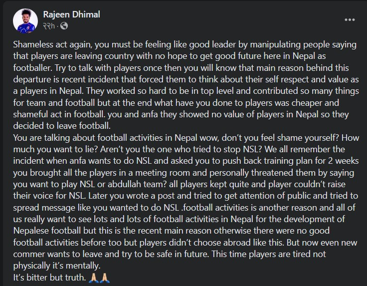 अलमुताइरीको सामाजिक संजालको गतिविधिलाई लक्षित गर्दै अनुभवी डिफेन्डर रंजित धिमालले सामाजिक संजालमार्फत नै असन्तुष्टि व्यक्त गरेका छन् । अंग्रेजीमै आफ्नो अभिव्यक्ति दिने क्रममा उनले एनएसएल रोक्न प्रशिक्षक अलमुताइरीको पनि भूमिका रहेको आरोप लगाएका छन् ।