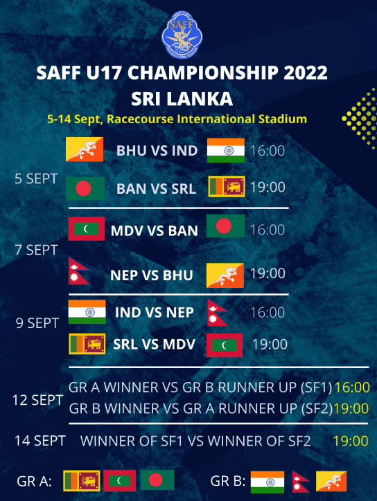 आयोजक दक्षिण एसियाली फुटबल महासंघ (साफ) ले आइतबार निकालेको खेल तालिका अनुसार नेपालले प्रतियोगिताको दोस्रो दिन भुटानसँग खेल्दै सुरुवात गर्नेछ । साफ यू–१७ च्याम्पियनसिप ५ देखि १४ सेप्टेम्वरसम्म श्रीलंकामा हुँदैैछ ।