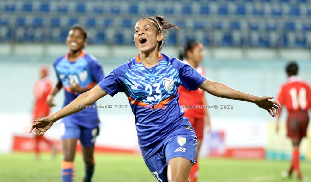 काठमाडौं (हाम्रो खेलकुद) – छैटौं महिला साफ च्याम्पियनसिप २०२२ अन्तर्गत समूह ए को खेलमा भारतले लगातार दोस्रो जित दर्ता गर्दै सेमिफाइनलमा स्थान बनाएको छ । माल्दिभ्सलाई ९-० ले पराजित गर्दै समूहबाट भारतसँगै बंगलादेश पनि अन्तिम चारमा प्रवेश गरेको हो ।