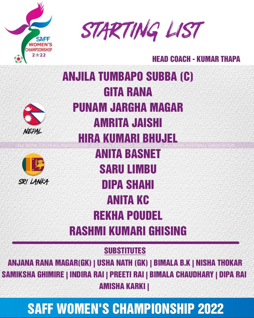 फरवार्ड सावित्रा भण्डारीलाई डेंगी संक्रमण भएपछि उनी आज विश्राममा छिन् । उनको स्थानमा रश्मीकुमारी घिसिङले सुरुवाती ११ मा स्थान पाएकी छिन् । त्यस्तै अमिशा कार्कीको स्थानमा रेखा पौडेलले सुरुवात गर्दैछिन् । भुटानविरुद्ध दोस्रो हाफमा रेखाले नै अमिशाको स्थान लिएकी थिइन् ।