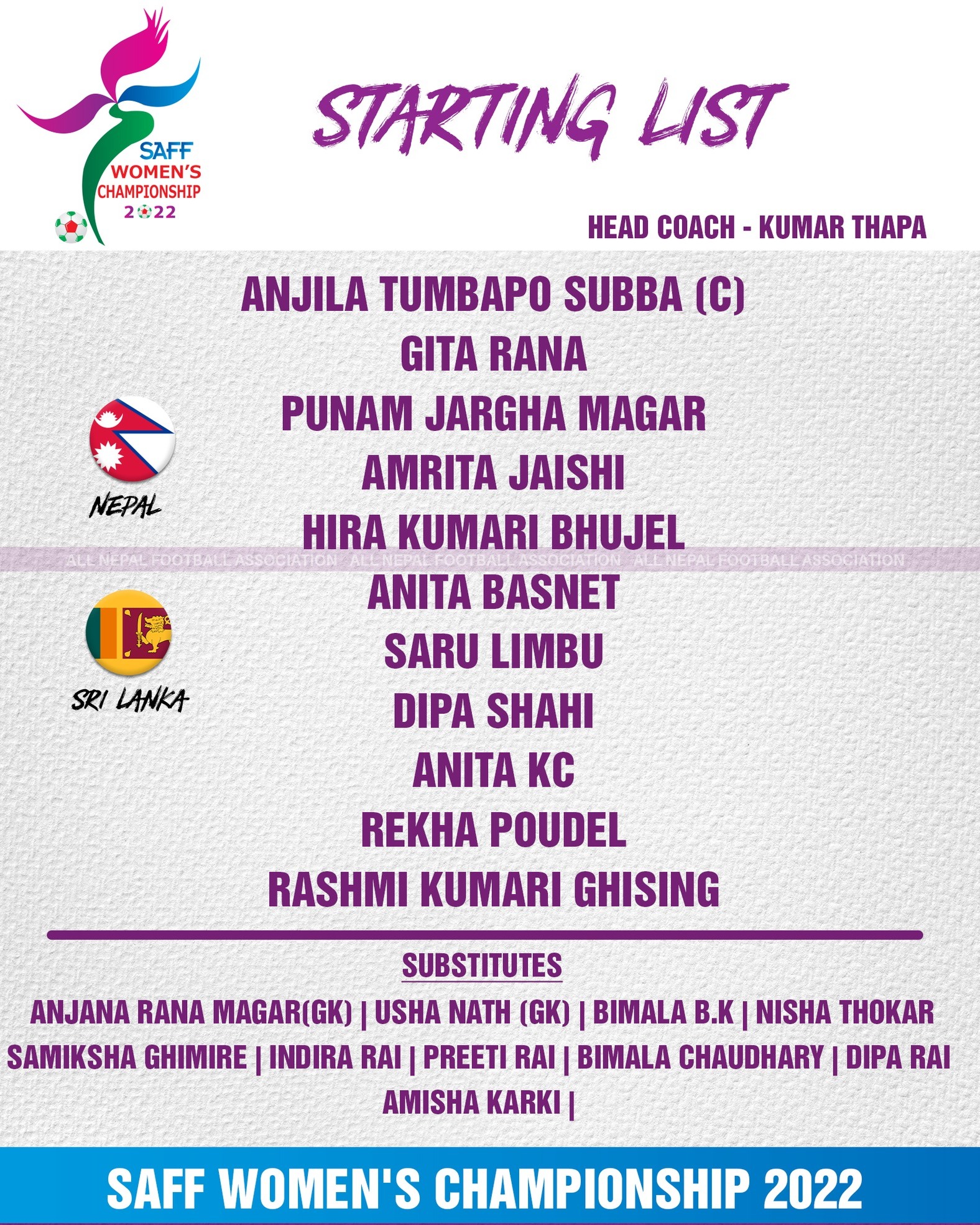 टोलीको गोलरक्षकमा कप्तान एन्जिला तुम्बापो सुब्बा नै छिन् । डिफेन्समा हिरा भुजेल, गीता राना, पुनम जर्घा मगर र अमृता जैशी निरन्तर छन् । मिडफिल्डमा अनिता बस्नेत, सरु लिम्बु, दीपा शाही र अनिता केसीले खेल्नेछन् । आक्रमण रेखा र रश्मीको जोडीले सम्हाल्नेछ ।
