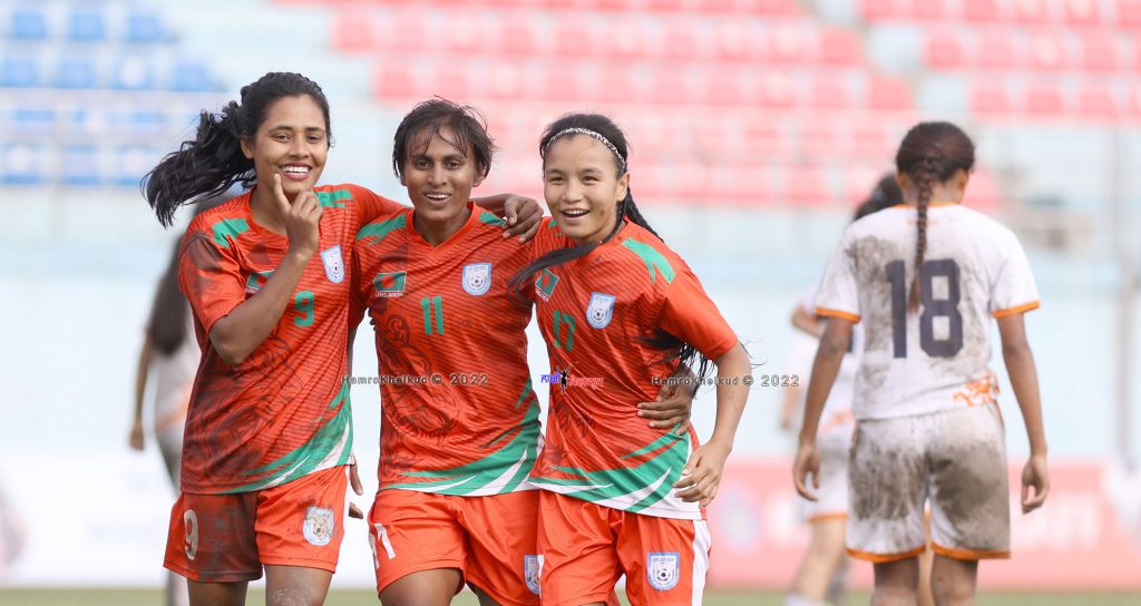 काठमाडौं (हाम्रो खेलकुद) – बंगलादेश राष्ट्रिय महिला फुटबल टोली दोस्रो पटक महिला साफ च्याम्पियनसिपको फाइनलमा प्रवेश गरेको छ । शुक्रबार भएको छैटौं संस्करणको पहिलो सेमिफाइनलमा भुटानलाई ८-० को फराकिलो अन्तरले पराजित गर्दै उपाधि भिडन्तमा स्थान पक्का गरेको हो ।