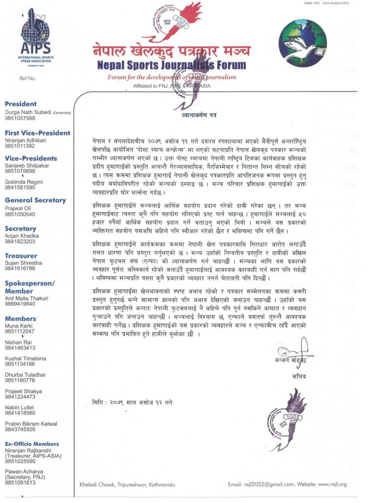 ’प्रशिक्षक हुमागाईंले नेपाली खेल पत्रकारमाथि निराधार आरोप लगाउँदै गलत धारणा पनि प्रस्तुत गरेका थिए । मञ्च उनको निन्दनीय प्रस्तुति र दाबीमा एन्फाको ध्यानाकर्षण गर्न चाहन्छौं ।