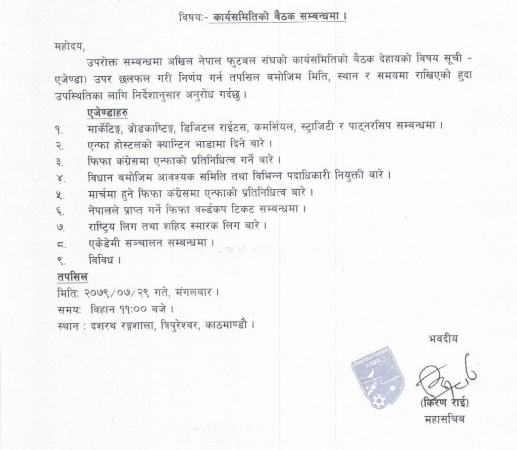 एन्फा महासचिव किरण राईले कार्यसमिति पदाधिकारी र सदस्यलाई मंगलबार पठाएको पत्रमा ९ वटा एजेण्डा समावेश छन् । मार्केटिङ, ब्रोर्डकाष्टिङ, डिजिटल राइट्स, कमर्सियाल स्ट्राटिजी र पार्टनरसिप सम्बन्धी, एन्फा होस्टलको क्यान्टिन भाडामा दिने, फिफा कंग्रेसमा एन्फाको प्रतिनिधित्व, विधान बमोजिम आवश्यक समिति तथा विभिन्न पदाधिकारी नियुक्त बारेमा पनि बैठकमा छलफल गर्न एजेण्डा तय भएको छ ।