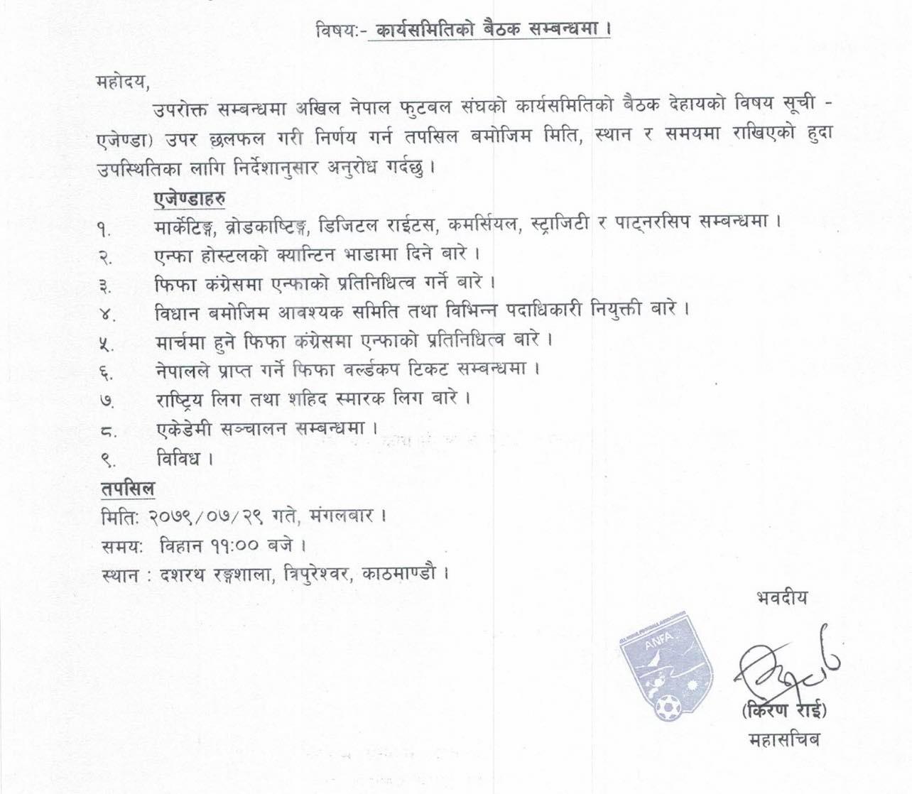 त्यस्तै बैठकले मार्चमा हुने फिफा कंग्रेसमा एन्फाको प्रतिनिधित्व बारे, नेपालले प्राप्त गरेको फिफा विश्व कपको टिकट, राष्ट्रिय लिग तथा सहिद स्मारक ए डिभिजन लिग, एकेडेमी सञ्चालन तथा विविध विषयमा छलफल हुनेछ ।