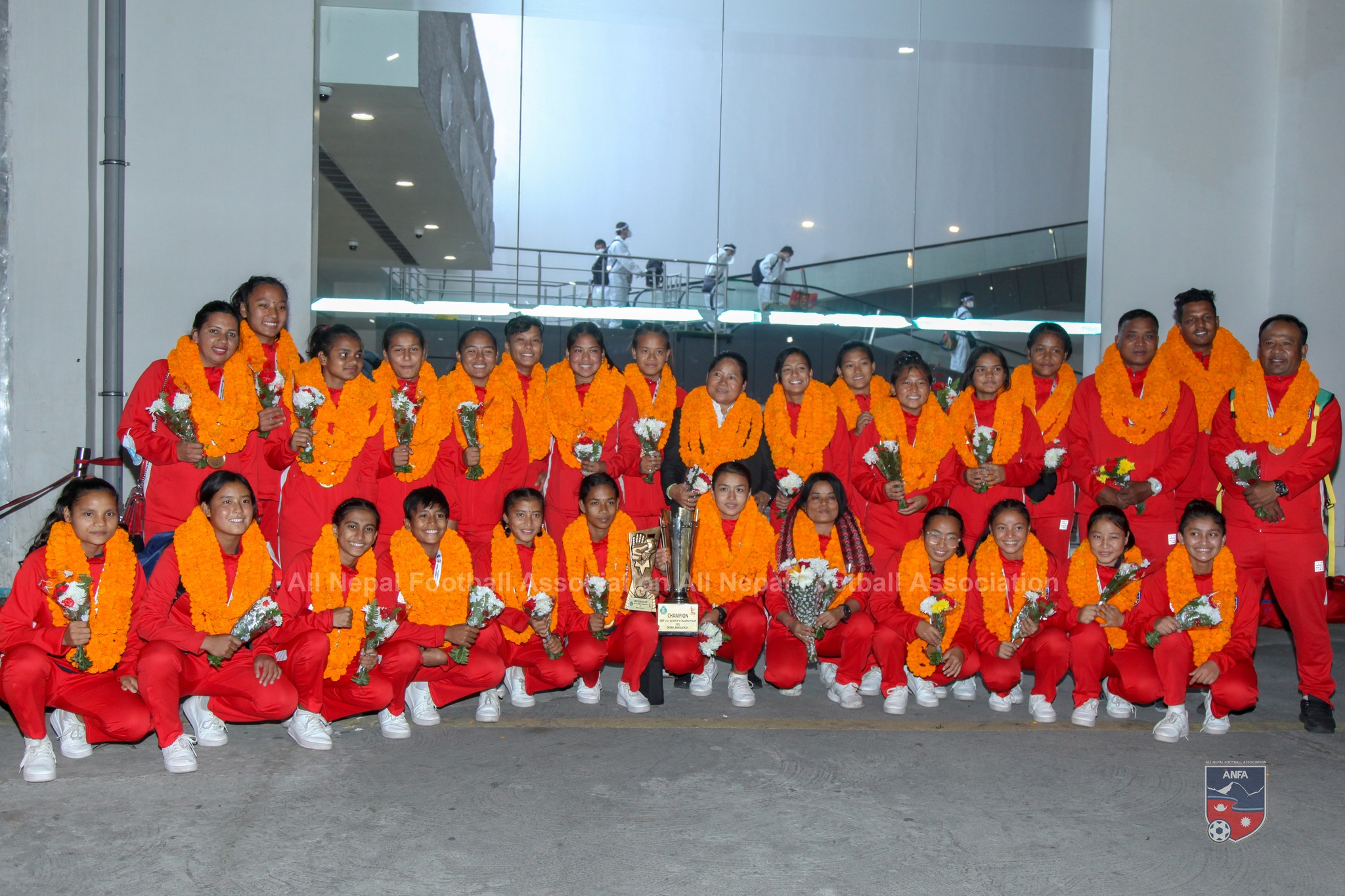 नेपाली टोली शनिबार साँझ हिमालयन एअरलाइन्सबाट त्रिभुवन अन्तर्राष्ट्रिय विमानस्थलमा आइपुगेको हो । च्याम्पियन नेपाली टोलीलाई राष्ट्रिय खेलकुद परिषद (राखेप)का सदस्यसचिव टंक लाल घिसिङ र एन्फाका अध्यक्ष पंकज विक्रम नेम्वाङ, उपाध्यक्ष वीर बहादुर खड्का, विराटजंग शाही, दावा लामा, सदस्य रविन्द्र चन्द र रमेश व्यन्जनकारलगायतले विमानस्थलमा गएर नै स्वागत गरे ।