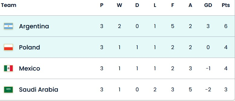 मेक्सिकोले साउदी अरेबियालाई २-१ ले पराजित गरेपनि नकआउट चरणमा स्थान बनाउन सकेन । यस समूहमा अर्जेन्टिना ३ खेलमा २ जित र १ हारसहित ६ अंकका साथ शीर्षस्थानमा रहयो । मेक्सिको र पोल्यान्डले समान ४-४ अंक जोडे । तर पोल्यान्ड (०) को गोलअन्तर मेक्सिको (-१) भन्दा राम्रो हुँदा गोल अन्तरमा पोल्यान्ड अघि रहयो । साउदी अरेबिया ३ अंकसहित पुछारमा रहयो ।