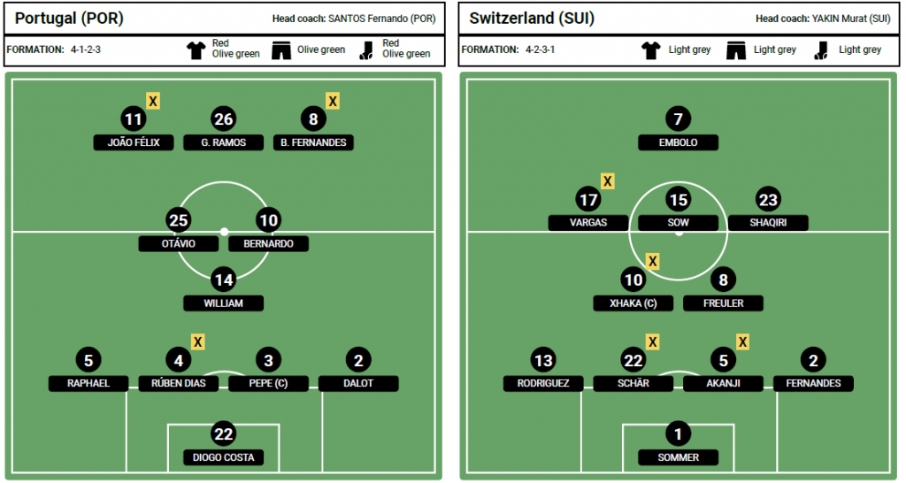 रोनाल्डोको अनुपस्थितिमा गोन्कालो रामोसले पहिलो रोजाइमा अवसर पाएका छन् । त्यस्तै जोआओ फेलिक्स र ब्रुनो फर्नान्डेस आक्रमणमा छन् । ओटाभियो, बर्नार्डो सिल्भा र विलियम कार्भाल्हो मिडफिल्डमा खेलिरहेका छन् । टोलीको कप्तानी डिफेन्डर पेपेले गर्दा उनलाई राफाएल गुरेरो, रुबेन डियास र डिओगो डालोटले साथ दिएका छन् । गोलरक्षकमा डिओगो कोस्टा छन् ।