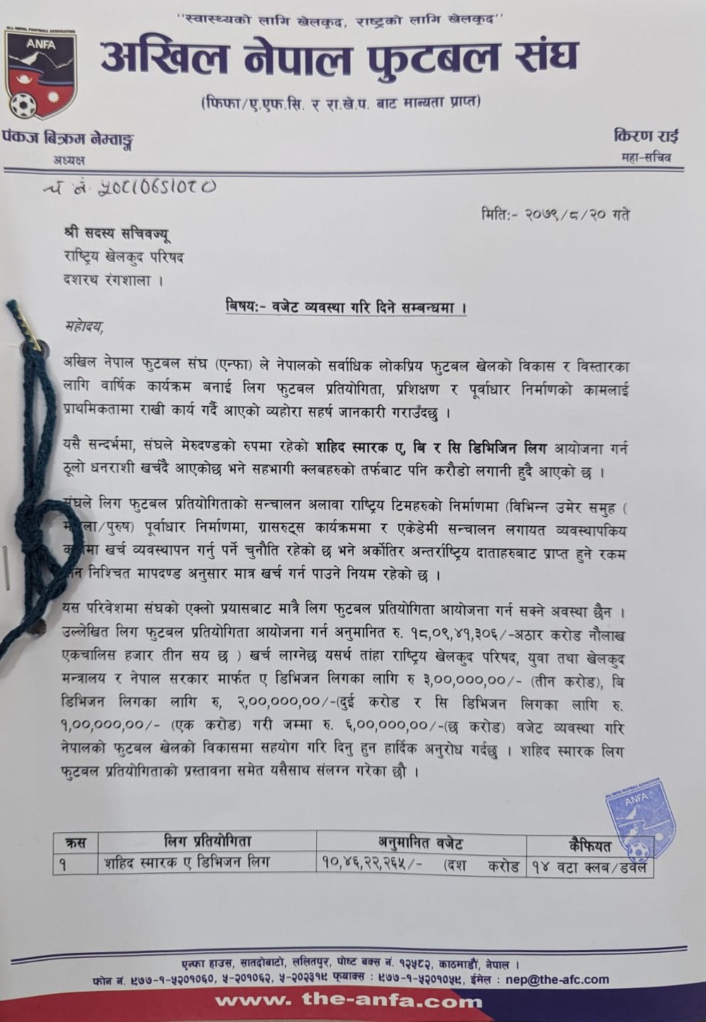अध्यक्ष पंकज विक्रम नेम्बाङ, उपाध्यक्ष दावा लामा र महासचिव किरण राईले बुधबार राखेप सदस्य सचिव टंकलाल घिसिङलाई लिगका लागि बजेट व्यवस्था गरिदिन पत्र बुझाएका थिए । ए,बी,सी डिभिजन लिगका लागि १८ करोड रुपैयाँ भन्दा बढी खर्च हुने उल्लेख गर्दै एन्फाले नेपाल सरकार, युवा तथा खेलकुद मन्त्रालय र राखेपमार्फत ६ करोड रुपैयाँ बजेट उपलब्ध गराइदिन अनुरोध गरेको छ ।