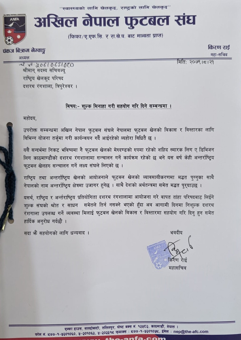 राष्ट्रिय तथा अन्तर्राष्ट्रिय खेलको आयोजनाले फुटबल खेलको व्यावसायिकरणमा मद्दत पुग्नुका साथै नेपालको नाम अन्तर्राष्ट्रिय क्षेत्रमा उजागर हुने, देशको अर्थतन्त्रमा समेत मद्दत पुग्ने भन्दै एन्फाले राखेप सदस्य सचिव घिसिलङलाई पत्र बुझाएको पत्रमा भनिएको छ, ‘यसर्थ, राष्ट्रिय र अर्न्तराष्ट्रिय प्रतियोगिता दशरथ रंगशालामा आयोजना गरे वापत परिषदबाट लिईने शुल्क संघको श्रोत र साधन समेतले तिर्न नसक्ने भएको हुँदा अब आगामी दिनमा निशुल्क दशरथ रंशगाला उपलब्ध गर्ने व्यवस्था मिलाई फुटबल खेलको विकास र विस्तारमा सहयोग गरि दिनु हुन समेत हार्दिक अनुरोध गर्दछौ ।’