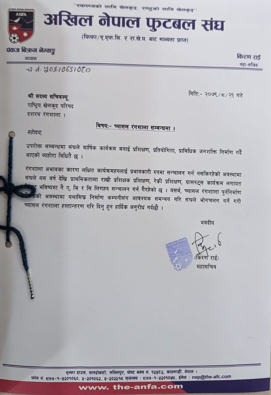 एन्फाले ए डिभिजन लिग र अन्तर्राष्ट्रिय फुटबल आयोजनाका लागि राखेपको मातहतमा रहेको त्रिपुरेश्वरस्थित दशरथ रंगशाला निशुल्क उपलब्ध गराउन आग्रहसहितको अर्को पत्र बुझाएको छ ।