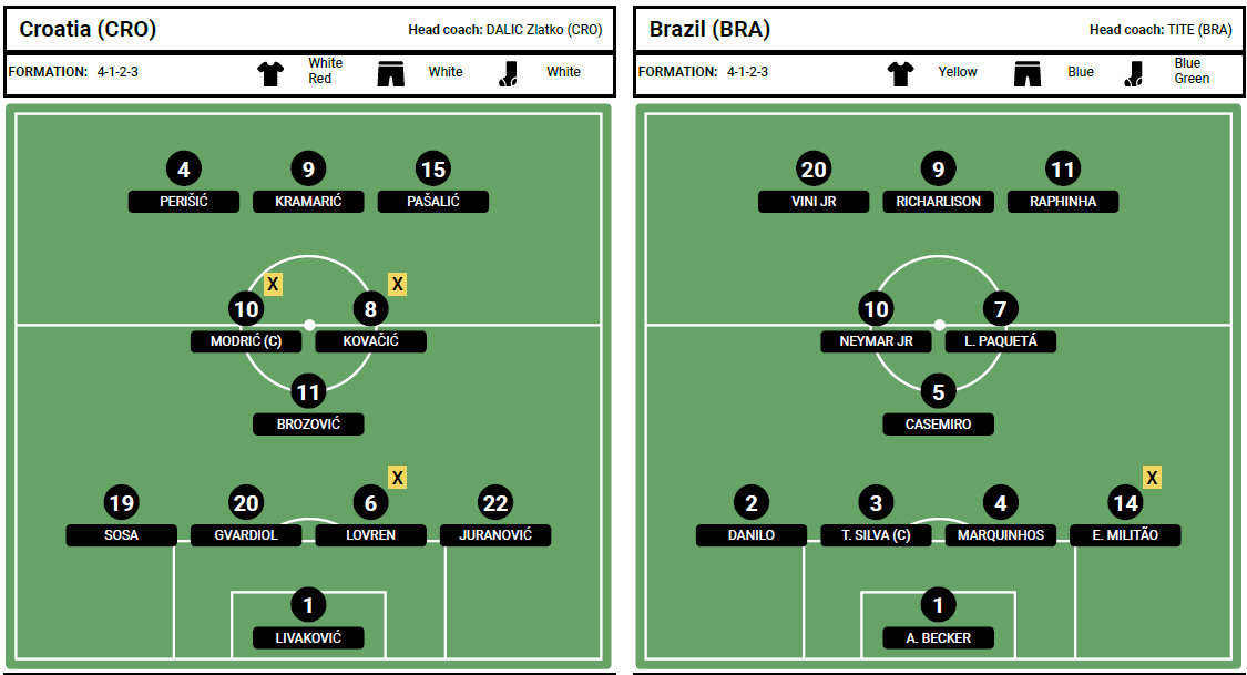 क्रोएसियाले अघिल्लो खेलबाट दुई खेलाडी परिवर्तन गर्दा ब्राजिलले कुनै खेलाडी फेरेको छैन । क्रोएसियाका लागि डिफेन्डर ब्रुनो सोसा र मारियो पासालीच सुरुवाती रोजाइमा छन् । पछिल्लो खेल सुरुवात गरेका बोर्ना बारिसिच र बुर्नो पेक्टोभिच बेन्चमा छन् । ब्राजिलले भने दक्षिण कोरियाविरुद्ध सहज जित दर्ता गरेकै टोली उतारेको छ ।
