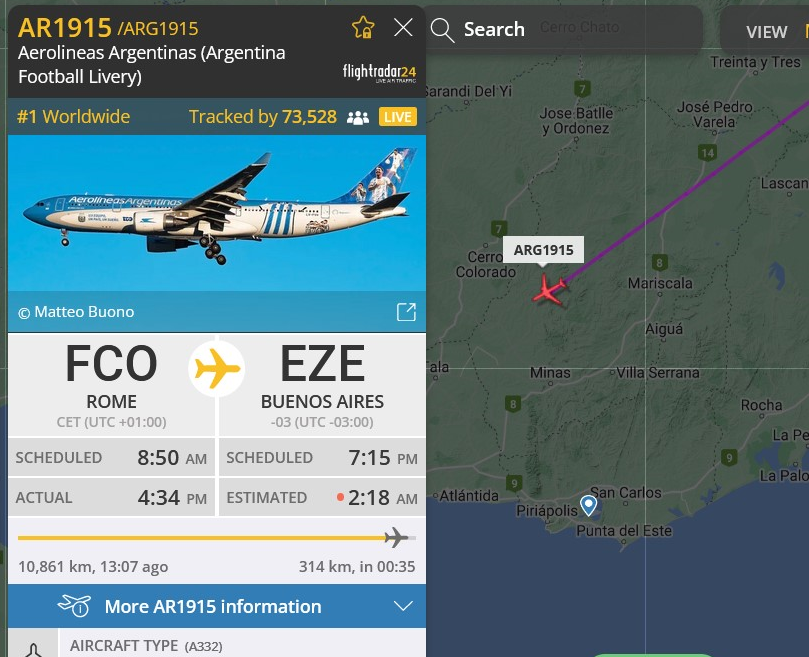अर्जेन्टिनी टोली रोम हुँदै अर्जेन्टिना पुग्दैछ । नेपाली समयअनुसार मंगलबार मध्यान्हमा अर्जेन्टिना पुगेपछि टोलीले विश्राम लिनेछ । यो समाचार तयार पार्दाको समयमा ७३ हजार जनाले विश्व प्रसिद्ध फ्लाइट राडर २४ को वेबसाइटमा अर्जेन्टिनी टोली चढेको विमानको यात्रा पछ्याइरहेका छन् ।