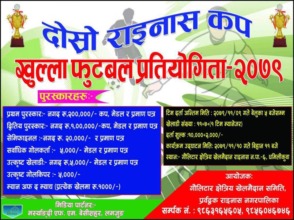 आयोजक गौलीटार क्षेत्रीय खेलमैदान समितीले पत्रकार सम्मेलन गरी दोस्रो संस्करणको राइनास कप फागुन १० गतेबाट हुने जानकारी गराएको छ । समितिका अध्यक्ष किरण श्रेष्ठले यसपाली कम्तीमा १६ टिमको सहभागिता रहेने बताएका छन् । गतवर्ष १२ टोलीले प्रतिस्पर्धा गरेका थिए ।